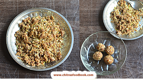 - Mix well to make the dry fruits pooranam. Make small balls and set aside.