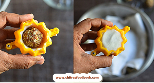 - Keep one dry fruits ball in the center of mould and cover the kozhukattai with the dough.