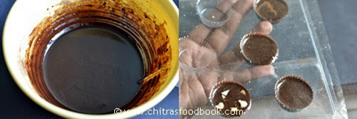 - Pour into chocolate mould or a small muffin liner lined with parchment paper. No need to line if you use chocolate mould. U can use wider bowls too but it takes longer time to set.
