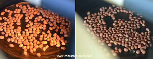 • If roasting in kadai, dry roast the peanuts till its skin crackles and color changes to golden. Switch off the flame & let it cool. Peanuts turn crunchy once it cools down completely.