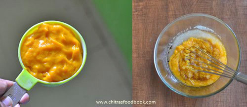 - In a wide bowl, take the mango pulp, cooking oil, sugar, vanilla essence and cardamom powder.