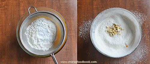 - To this mixture, sieve and add maida, baking powder and salt. Add nuts.