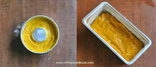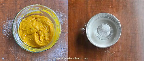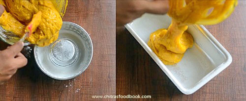 - Mix gently to make cake batter. Grease a baking pan with oil and maida.