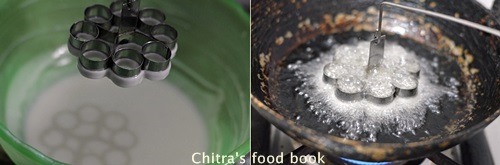To make a perfect eggless rose cookies, the consistency of batter and heating point of oil is more important. I have explained them in Method section below. Also go through my notes before you start if you are a beginner. Ok, Lets see how to make this eggless rose cookies/Achu murukku/Kerala achappam without egg at home easily.
