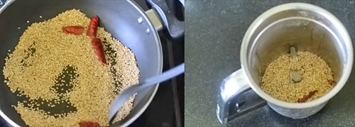 - Heat a kadai and dry roast the sesame seeds and red chilli till seeds splutter.