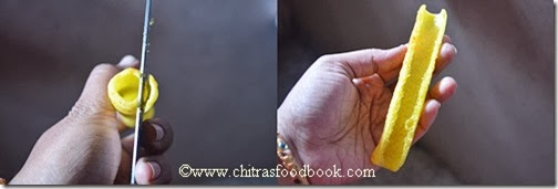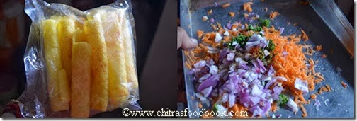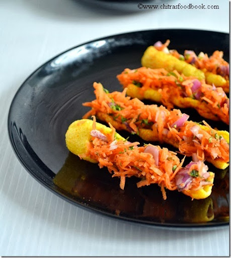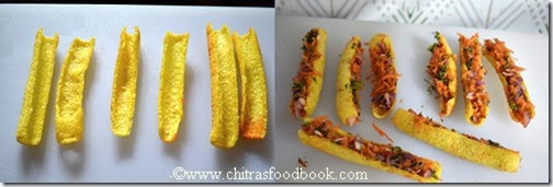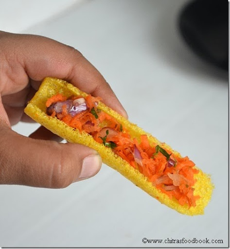No need to say much about fryums.I hope all of you have store bought, colourful, cylindrical shaped fryums also called as “Golden finger fryums”. I usually fry it in weekends or as a side dish for variety rice.There are many varieties of fryums and the one i used here is the long variety.In tamil we call it as “Kudal appalam”. Recently i bought this in a grocery store to make this easy,interesting chaat.Thanks to my friend Shalini from whom i got this idea.It was very nice and Raksha loved it a lot.Only thing is it has to be served within a minute after stuffing else it will become soggy very quickly.I stuffed as much grated carrots as i can to make Raksha eat raw carrot