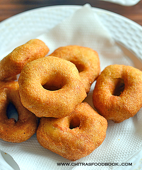 - For method 2 to shape vada : Grease hands with water and take a small portion of batter. Make a hole the center and shape the vada, Drop in hot oil to deep fry.