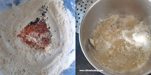- In a wide bowl,sieve rice flour and besan flour.