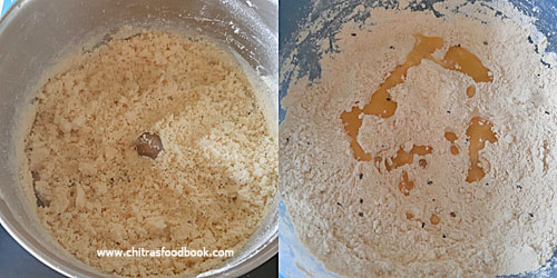 - Add this ground garlic powder to the rice flour and mix well. Lastly add the melted butter and spread it well with your hands. Try to hold little quantity of flour after mixing. You should be able to hold the shape but it should crumble when you drop it. This shows fat content is enough for the dough.