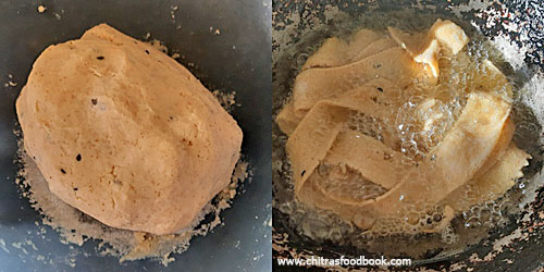 - Take the ribbon pakoda mould along with the murukku press. Grease with oil and fill the dough. Heat oil to deep fry and check the oil temperature by dropping a pinch of dough. If it rises to the top immediately, oil temperature is just right.