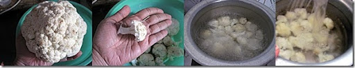 - Remove florets from cauliflower. Parboil adding salt and turmeric powder.