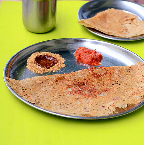 My mom & MIL makes this dosa in a healthy way without adding rice flour. But I add little rice flour to make it crispy. Some people also add curd or buttermilk to get a mild tangy taste but I don’t add it. My mom & mil makes coconut chutney as side dish for godumai dosa. When I was young, I used to have it with sugar as side dish. But now my vote is for spicy tomato chutney. Sendhil loves to have this dosa with idli podi. So in the above picture, you can find the dosa with my favorite & his favorite side dishes and a store bought juice. Whatever be the side dish, it tastes great when eaten hot ! Lets see how to make South Indian style godhumai dosa recipe with stepwise pictures and a video !