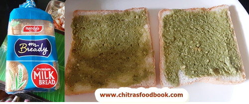Here I have made it simple without adding coconut, chaat masala etc. Instead I used roasted gram dal / chutney dal for to make a thick spreadable chutney. Roasted gram dal helps to give a binding and acts as a thickening agent. To make bright green colored chutney, I used turmeric powder and a pinch of sugar. Do not skip it. Ok, lets see how to make cheese chutney sandwich recipe with step by step pictures.