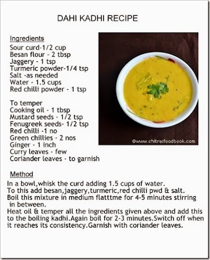 I prepared Kadhi as an accompaniment for moong dal khichdi. It was very nice. We also had this mixing with plain rice and roasted papad.
