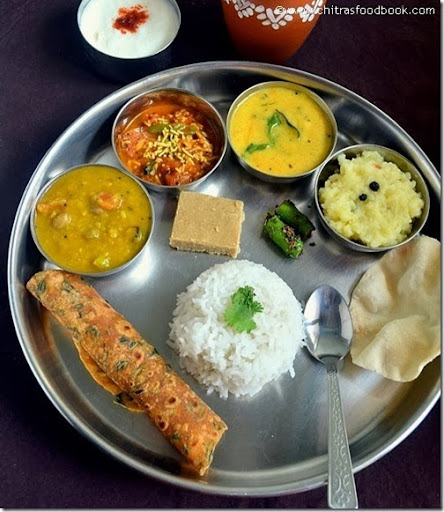 In the above Gujarati thali recipes picture, I have plated Rice, Methi thepla, Moong Dal khichdi, Dahi kadhi, Gujarati Sev Tameta nu Sak / Sev and Tomato Curry, Green chilli pickle, Masala chaas, Oven roasted papad & curd.