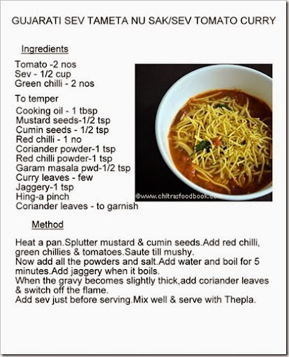 Tamatar sev curry was a nice combo for thepla. It was mildly tangy and addition of sev made it more tasty. I used MTR Sev, store bought ones. It was slightly thicker than the usual sev. We had this curry as an accompaniment for curd rice too..