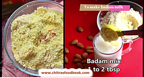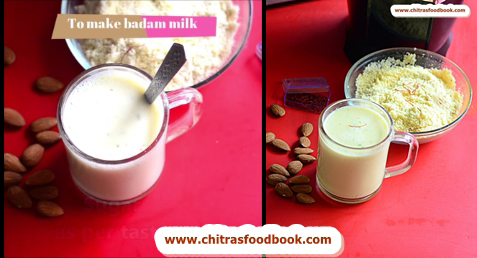 - To make badam milk, take hot milk in a cup. Add sugar, badam milk mix and mix well.