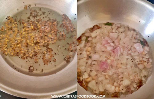 - Wash and chop onion, garlic finely. Heat oil and splutter mustard seeds, urad dal, fennel seeds.