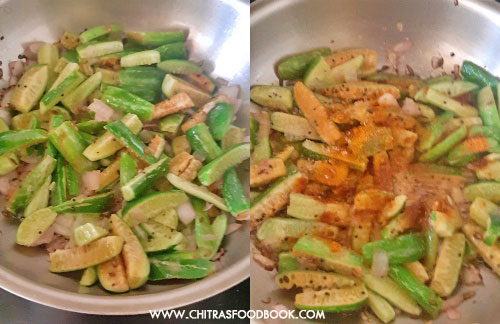- Saute in low flame for 2 to 3 minutes to coat the masala well. Sprinkle water and cover cook in low flame till kovakkai turns soft and well cooked.