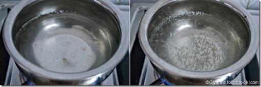 • In a bowl , take the water . Add a tsp of oil.Allow it to boil for 2-3 minutes.When it boils,small bubbles will appear in sides first. Then it will appear in bottom. After 2 minutes it will start to roll boil with big bubbles. Switch off the flame as soon as u see one big bubble.Never allow to roll boil completely.It will be just right for the flour to cook and u’ll get a non sticky dough.( No problem even if it roll boils slightly but u will find it really hard to press.)