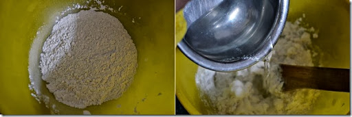• In a vessel , keep the flour mixed with salt .Add this water little by little to the flour and mix well with a ladle..Do not pour all the water.U may get some excess water remaining.I used 1.3 cups of water for 1 cup of rice flour. It may vary up to 1.5 cups.