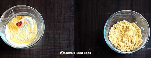 - Heat cooking oil and add it to the flour. Mix with a spoon till oil spreads well in the flour.