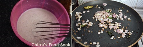 • Mix all the ingredients given under “ To batter”.Heat oil in a kadai and temper all the ingredients in the same order given under “ To temper”.Saute the onions,chillies till transparent.( Usually i do tempering job in dosa pan itself)
