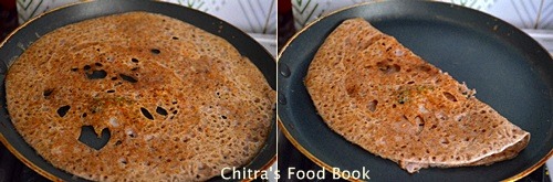 • Drizzle a tsp of oil around the dosa and cook for one side in medium flame till the edges start to lift slightly. Flip the dosa & cook for a minute.Remove in a plate n enjoy with chutney or idli podi