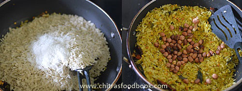 - Clean the poha if needed but without washing in water. Heat oil in a kadai and splutter mustard seeds, Urad dal, chana dal, pinched red chillies, curry leaves, hing and turmeric powder. Add poha, salt, sugar and pepper powder. Saute well until poha turns crispy. Keep the flame medium to high and roast patiently by staying nearby. Add roasted peanuts and mix it. Switch off the flame and let it cool in the kadai itself.