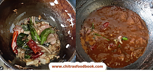 - Add red chilli, green chilli and curry leaves. Saute onion till transparent.