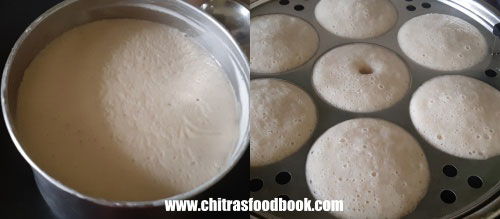 - The next morning, batter would have raised well. Add required salt and mix well. Take idli plate and grease with gingely oil.