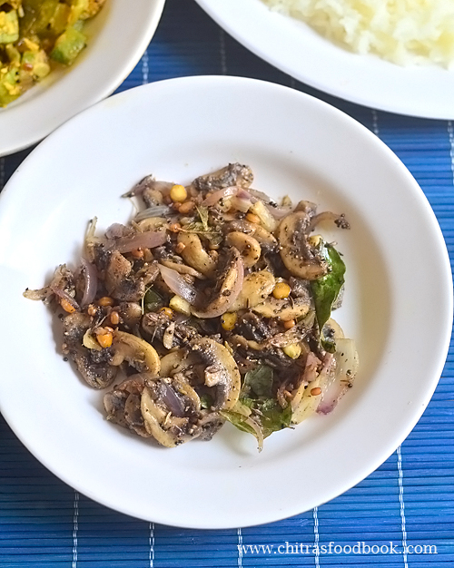 South Indian, Chettinad style mushroom pepper fry called as kalan milagu varuval in Tamil. Its a good side dish for rice.