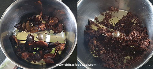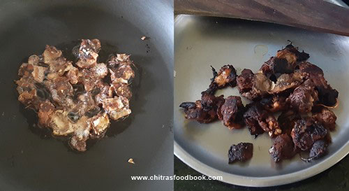 - Heat 1 tbsp oil and roast the tamarind pieces. Switch off the flame, let it cool.