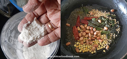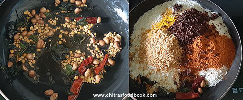 - Grind to a fine powder. Heat oil in a kadai. Temper mustard seeds, urad dal, chana dal, roasted peanuts, curry leaves, hing, red chilli.