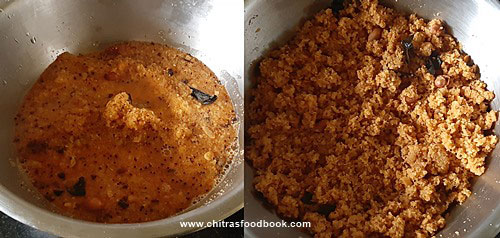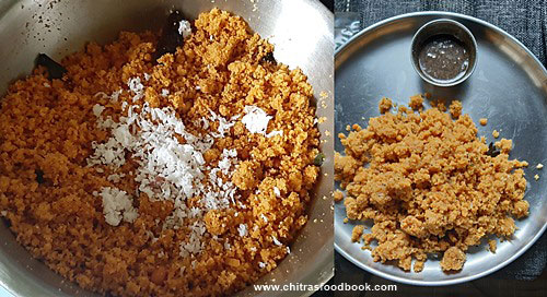 - Add powdered poha, tamarind powder, rasam powder, jaggery and salt.