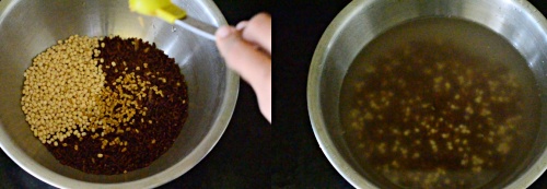 - Add enough water and soak them for 5 hours. Alternatively you can soak the rice separately and soak the urad dal + fenugreek seeds separately.