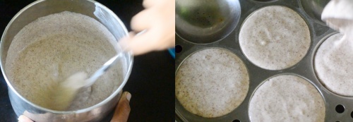 - Boil water in an idli pot. Grease idli plate with sesame oil. Pour the batter and place in idli pot. Steam it for 15 minutes.