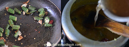 • In the same kadai, heat coconut oil and splutter mustard seeds, urad dal, red chilli and curry leaves. Add chopped ladies finger and onion, saute till turns transparent. Add this to the cooked dal, tamarind extract, ground coconut paste and cooked drumstick pieces. Check for taste and add more salt if needed. Let the sambar roll boil for few minutes. Nice aroma wafts through.