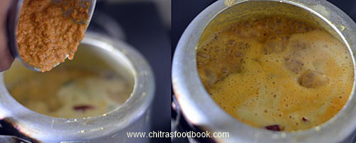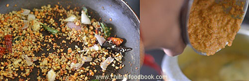 • In a kadai, heat coconut oil and saute all the ingredients in medium flame given under “ To saute & grind”. Saute till you get nice aroma & color of coconut changes golden. Do not burn any of the ingredients. Let them cool down. Grind everything to a smooth paste adding required water. Set aside.