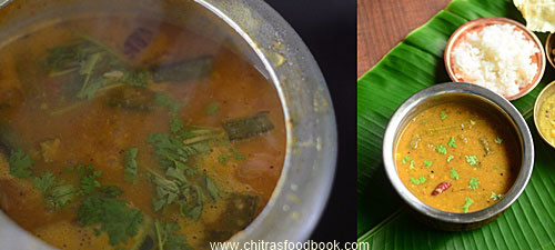 • Garnish with coriander leaves and give a boil. Switch off the flame and cover it with  a lid. Give a standing time of 30 minutes before serving. Enjoy mixing with plain rice. Add few drops of ghee while serving !