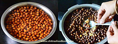 • Add enough water to cover the chana. Pressure cook it for 2 to 3 whistles in low flame. Remove after the steam is released completely. Press to check it soft and well cooked. Drain the excess water if any and set aside.