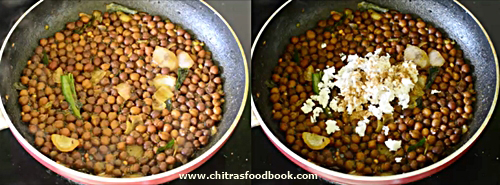 • Lower the flame completely and add the garam masala powder in oil. Saute quickly. Add the cooked chana, required salt and mix well. If necessary, add little water too.