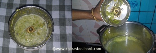 • Heat a pressure cooker base or a big heavy bottomed vessel. Add 2 cups of water to the ground koozh batter and mix it without lumps. Heat 8 cups of water to the cooker and let it boil. Add the chillies paste and cumin seeds while the water boils.