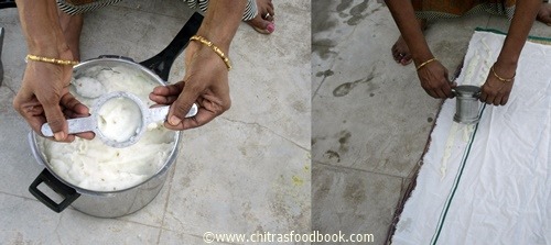 • Allow it to sun dry for a day till the evening and dry it under the fan over night. It will be half dried. The next day morning, sprinkle water on the back side of cloth and remove the half dried vadam. Spread them well and again sun dry it for whole day. Repeat the same process till they are completely dry. It takes maximum 3-5 days based on the weather.