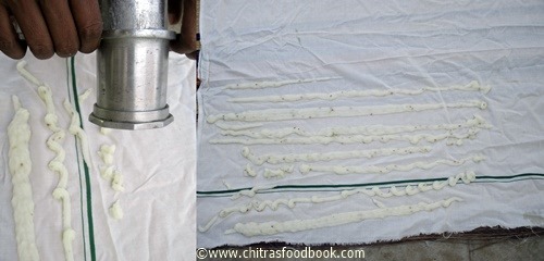 • Wash and spread a white cotton cloth or polyester cloth ( helps to remove easily) or plastic sheet. Press the murukku press over the cloth vertically as shown in the picture.