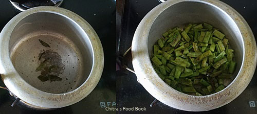 2. In a pressure cooker base, heat coconut oil and splutter mustard seeds, curry leaves. Add the chopped cluster beans and saute for 2 minutes in medium flame.