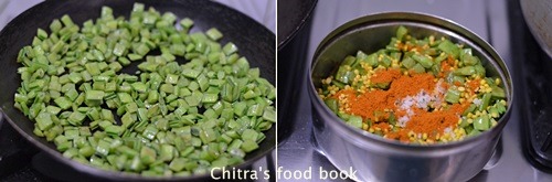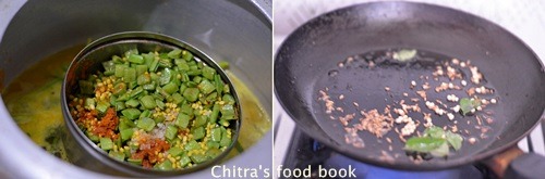 • Wash the cluster beans.Discard the head and tail portions and chop it finely. In a kadai,heat 1/2 tbsp of oil and saute the cluster beans for a minute.Then transfer this to a pressure cooker base and add yellow moong dal,tamarind,sambar powder,salt and little water( I kept in a small tiffin box and cooked it along with dal in pressure cooker).