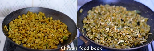• Now add the cooked cluster beans( if adding with excess water,allow it to boil well and drain) and boil well for minute.After the poriyal becomes dry,add sugar and mix well.Lastly add grated coconut,mix well and switch off the flame.Serve with rice,gravy/kuzhambu and papad !