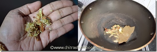- In a kadai, heat a tsp of oil & saute the green chillies & fried gram dal. Take this in a mixie jar & add grated coconut, ginger, garlic cloves, poppy seeds & fennel seeds. Grind everything to a smooth paste adding required water. Set aside.