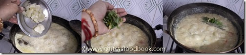 - After the carrots are cooked well, add the ground coconut paste and cooked moong dal. Boil for sometime. Check for salt. Add the potato cubes, allow the gravy to boil till thickens slightly.